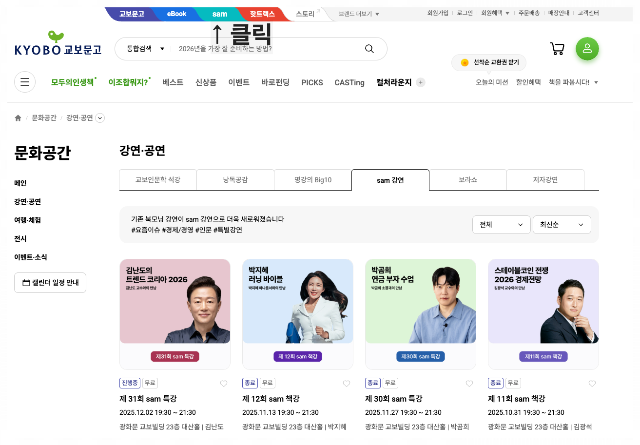 교보문고 웹사이트 > 상단 탭 'SAM' > 강의 선택하니 좋은 강의를 무료로 들어볼 수 있는 기회가 있어서 신청했습니다.